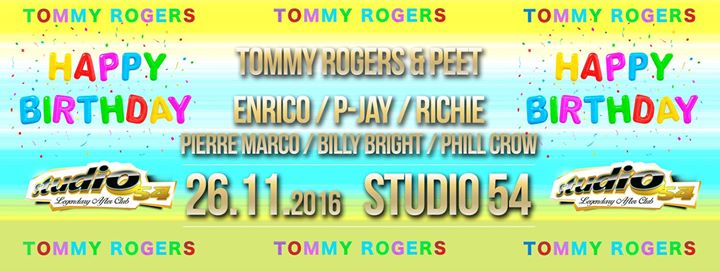 Birthday party of Tommy Rogers ve Studiu 54 v sobotu rano od půl noci 26.11.2016. Tommy Rogers oslaví své narozeniny na základně ve Studiu 54 a připravil si pro vás narozeninový večírek....